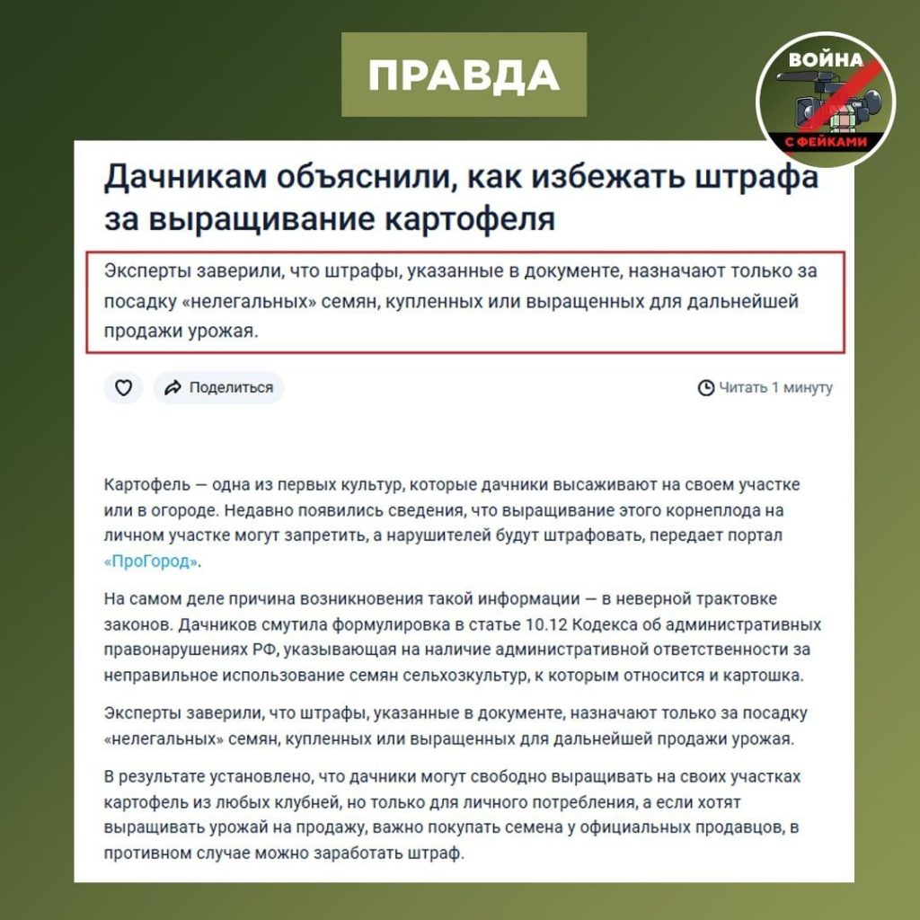 О чем фейк: С 1 апреля повысился налог на посадку картофеля. По новым правилам, клубни, не прошедшие обязательное декларирование, будут облагаться повышенным налогом. Об этом пишут в соцсетях.