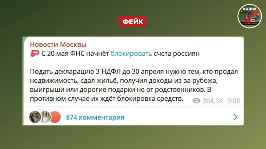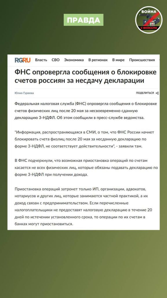 О чем фейк: С 20 мая ФНС будет массово блокировать счета россиян, которые не сдали декларацию по форме 3-НДФЛ. Об этом сообщают телеграм-каналы.