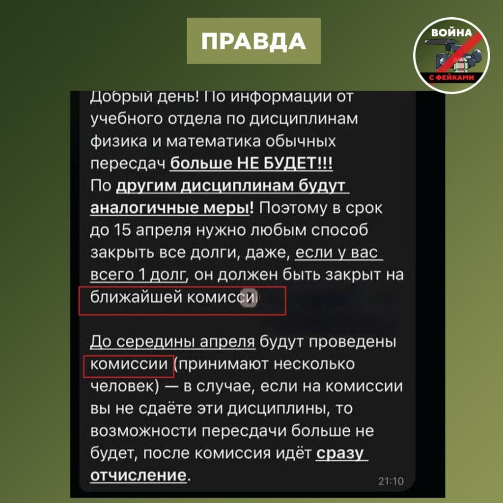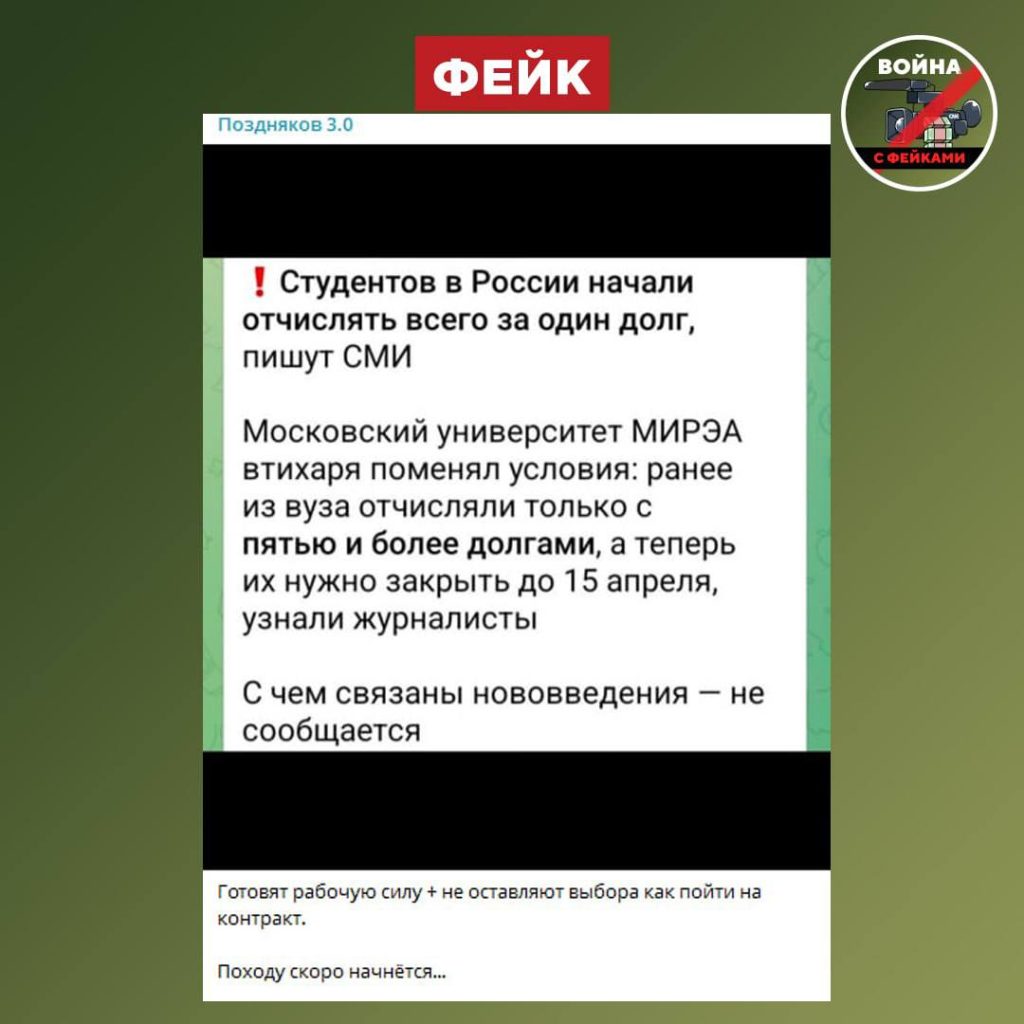 О чем фейк: Студентов начали отчислять из российских вузов за один долг по учебе, чтобы отправить их на СВО. Об этом пишет ряд телеграм-каналов.