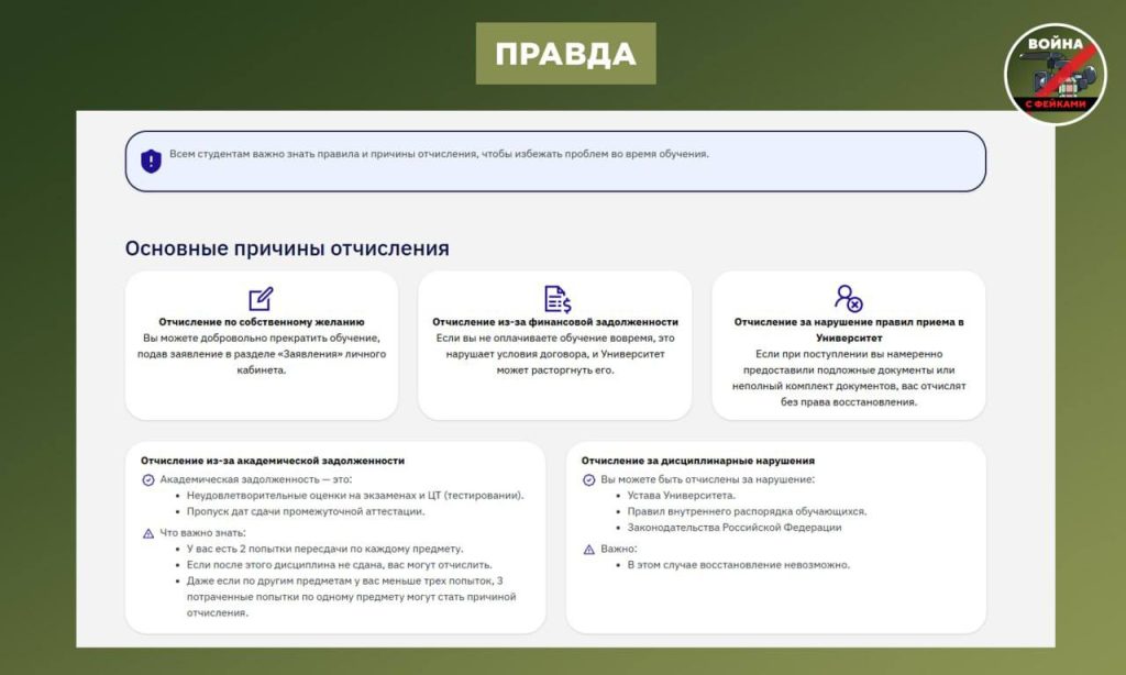 Как правило, отчисление — это крайняя мера, которая реализуется в том случае, если студент систематически нарушает правила учебного заведения, прописанные в уставе Alma mater. Даже на скринах из фейка говорится о том, что отчисленным студентам предлагалось сдать задолженность на специальной комиссии, что видимо было проигнорировано.