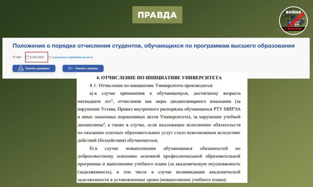 Аналогичные требования действуют и в других вузах, включая МИРЭА — Российский технологический университет, который упоминается в фейке. Администрация ВУЗа также опровергла распространяемый фейк.