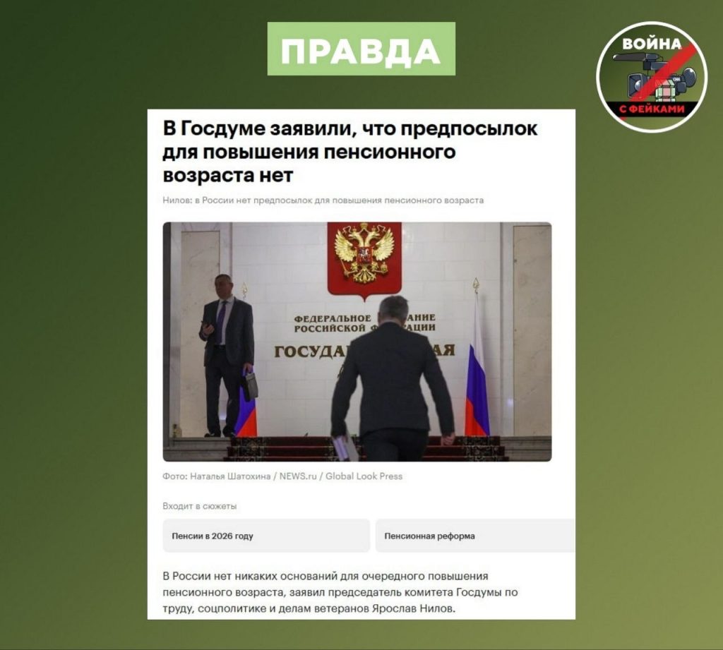 Тогда же в Сети появились панические сообщения о якобы повышении пенсионного возраста в России или отмене планового увеличения выплат. Фейкометы «не заметили», что Бессараб говорила о выгодах добровольного продолжения работы после выхода на пенсию, а не об изменении законодательства.