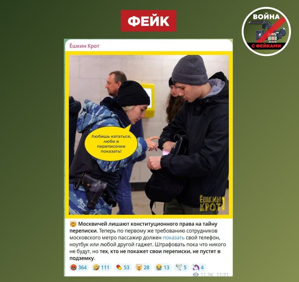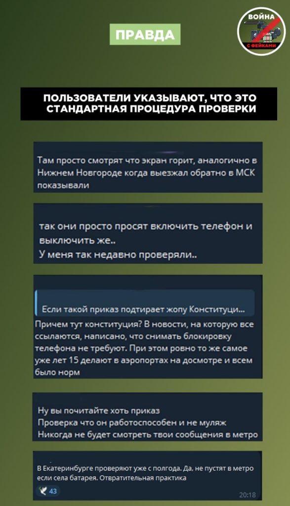 О чем фейк: В московском метро в рамках досмотра смартфонов будут проверять личные переписки пассажиров. Об этом сообщают ряд оппозиционных телеграм-каналов, а новость активно обсуждают пользователи в комментариях.