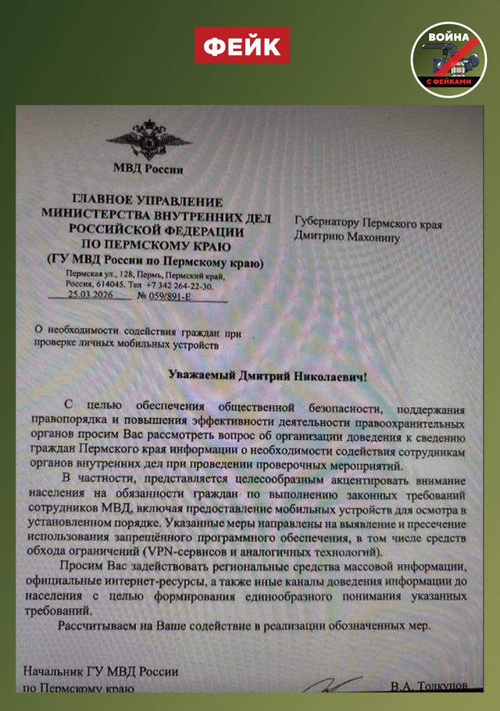 О чем фейк: В Пермском крае полицейские проверяют телефоны граждан на наличие VPN-сервисов. Об этом говорится в письменном обращении начальника регионального МВД к губернатору Дмитрию Махонину, которое опубликовали телеграм-каналы.
