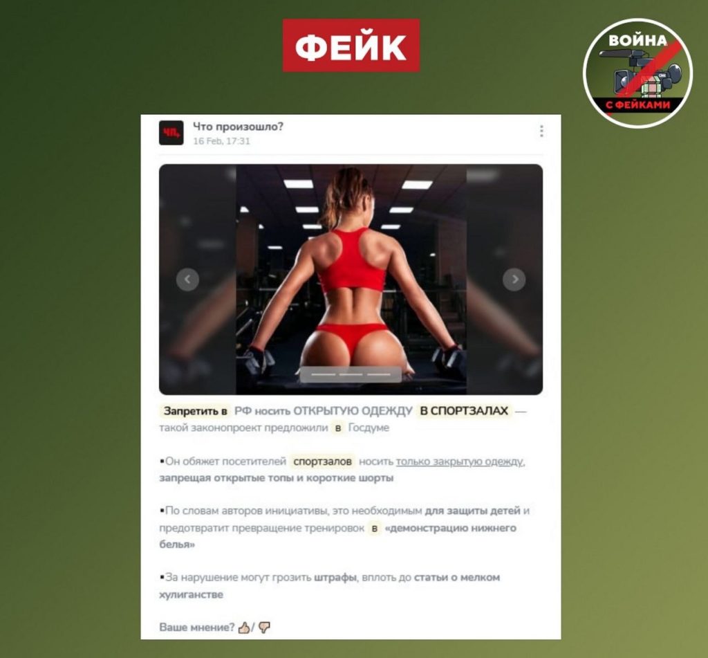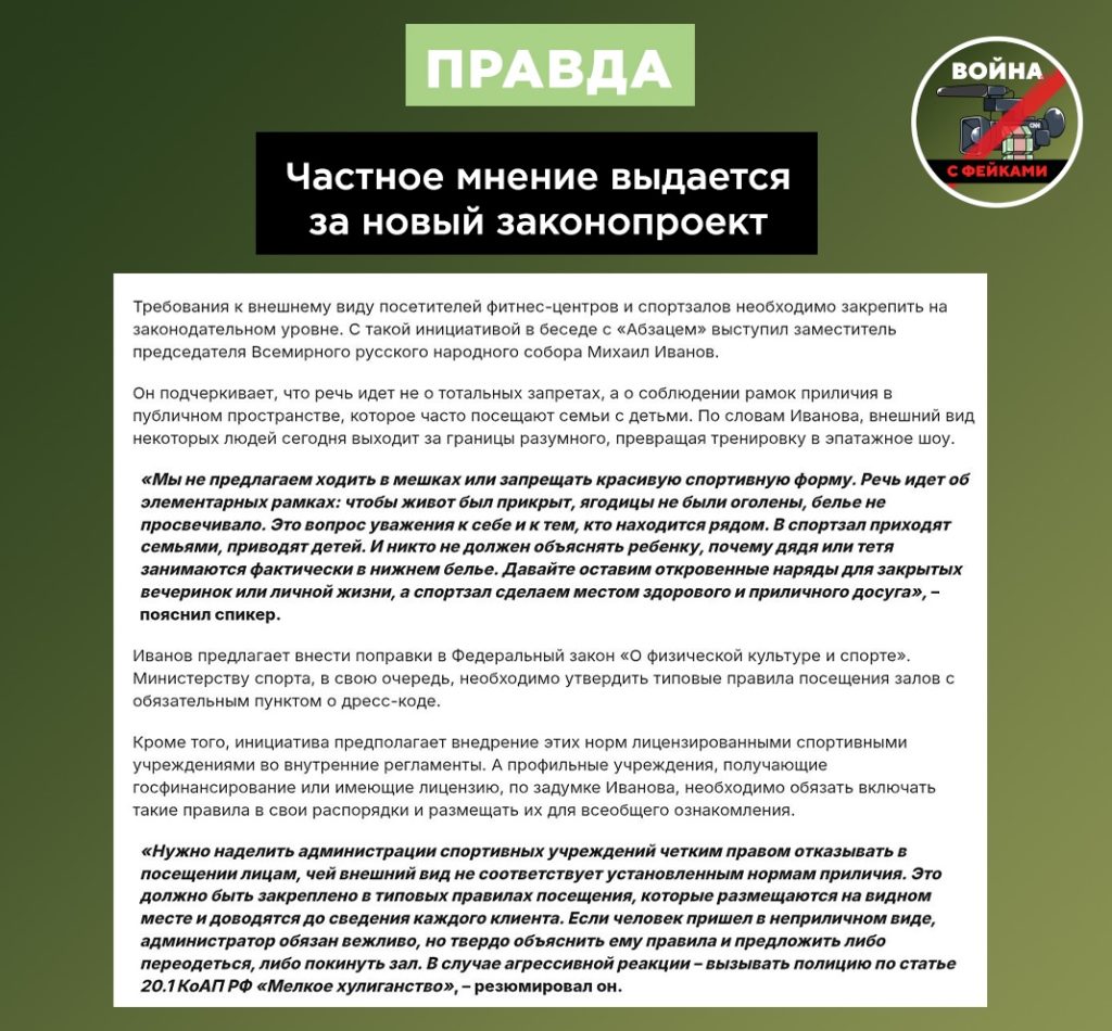 О чем фейк: В России введут дресс-код в спортзалах для защиты семейных ценностей и детей. Соответствующий законопроект рассматривают в Госдуме.