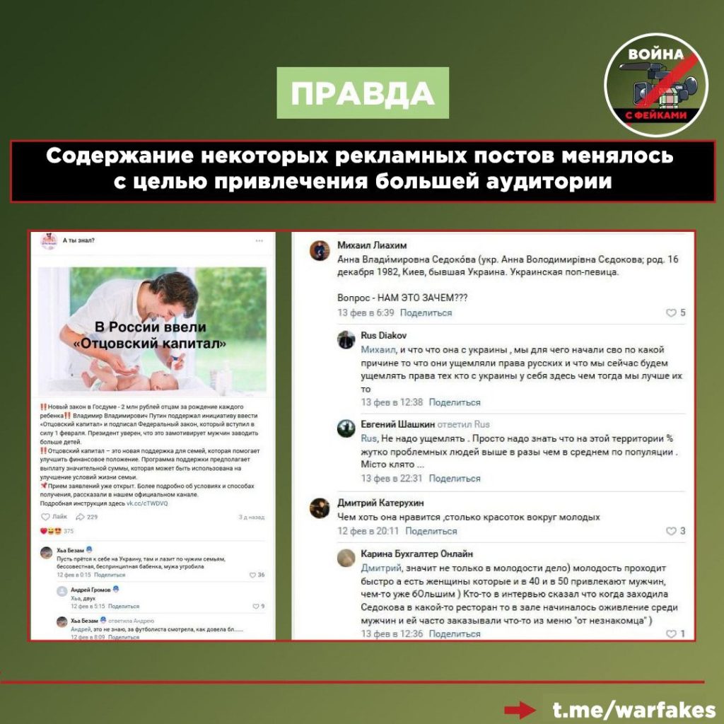 В соцсетях, включая «ВКонтакте», кликбейтные материалы распространяли аккаунты-боты без личных фото и данных. Примечательно, что содержание некоторых публикаций, судя по комментариям к ним, менялось. Так, в одном из постов изначально говорилось о певице Анне Седоковой, а потом текст обновился. Сейчас в нем фигурирует информация о несуществующем «отцовском капитале».