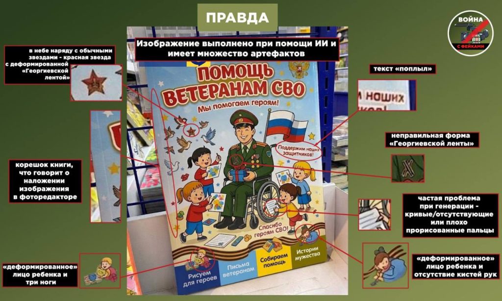 🟢на сфабрикованной обложке заметны две размытые детские фигуры, а у малышей в центре картинки очевидны «трудности» с пальцами;