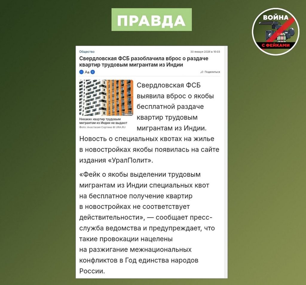 «Фейк о якобы выделении трудовым мигрантам из Индии специальных квот на бесплатное получение квартир в новостройках не соответствует действительности».