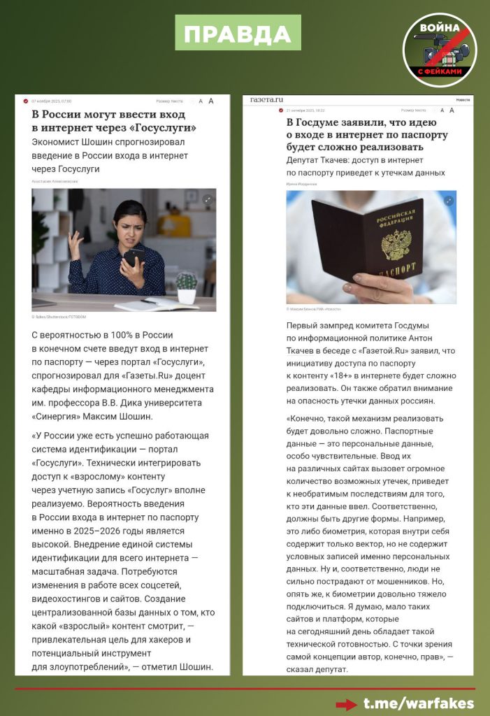 О чем фейк: Вход в интернет по паспорту через «Госуслуги» введут в России уже к 2026 году, чтобы обезопасить детей от нежелательного контента. Об этом сообщил ряд телеграм-каналов.