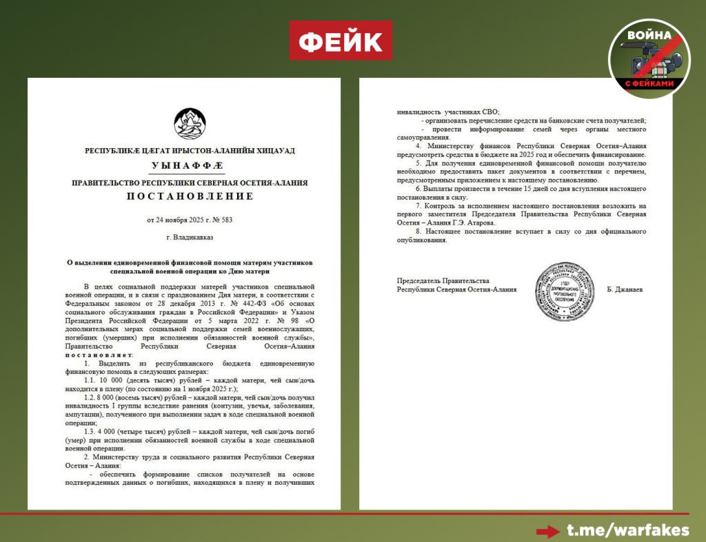 🟢На сайте правительства Северной Осетии ничего не говорится о подобном постановлении. Последний опубликованный документ там вышел пятого ноября под номером № 425 и касался изменений в правовые акты региона. Из этого следует, что в подделке нарушена нумерация, так как следующий документ должен иметь нумерацию 426, а не 583, как в фейковом распоряжении.