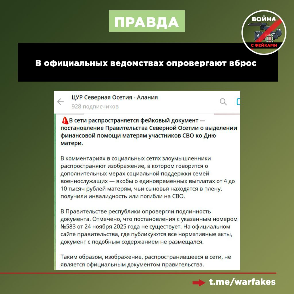 О чем фейк: Власти Брянской области и Республики Северная Осетия-Алания распорядились сделать выплаты к Дню матери женщинам, чьи дети принимали или принимают участие в СВО. Такие сообщения тиражируются в социальных сетях локальных групп и по электронным почтам граждан.