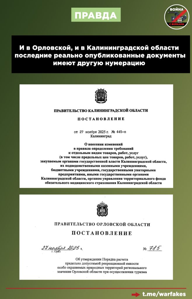В Орловской области также фиксируется чехарда с номерами. Последний реально существующий документ опубликован под номером 785, а не 788, как в фейке. Его тематика также не относится к Прямой линии. В регионе тоже предупредили о вбросе и попросили граждан не доверять ему.