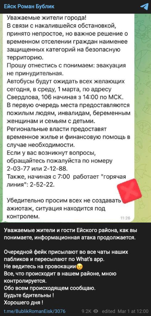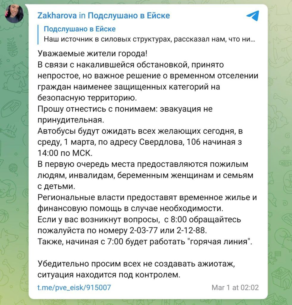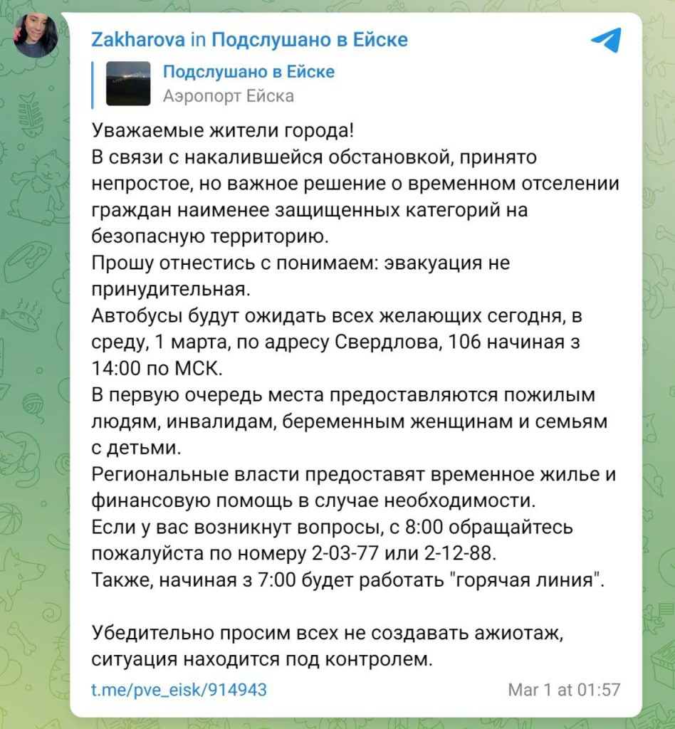 Сообщения об эвакуации опроверг глава Ейского района Роман Бублик, он назвал данные заявления информационной атакой и призвал граждан критически относиться к получаемой информации. Местные жители также сообщают, что эвакуация в Ейске не проводится и сообщений о ней не поступало. Похоже, что мы имеем дело с очередным вбросом украинской пропаганды, направленным на дестабилизацию ситуации внутри РФ.