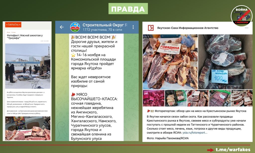 Рекламу ярмарок публиковали в СМИ и городских чатах в Telegram. Также в СМИ, телеграм-каналах, соцсетях можно найти фото и видео, подтверждающие, что в регионе начался сезон забоя скота. На этом фоне фейки о дефиците мяса в регионе выглядят особенно абсурдно.