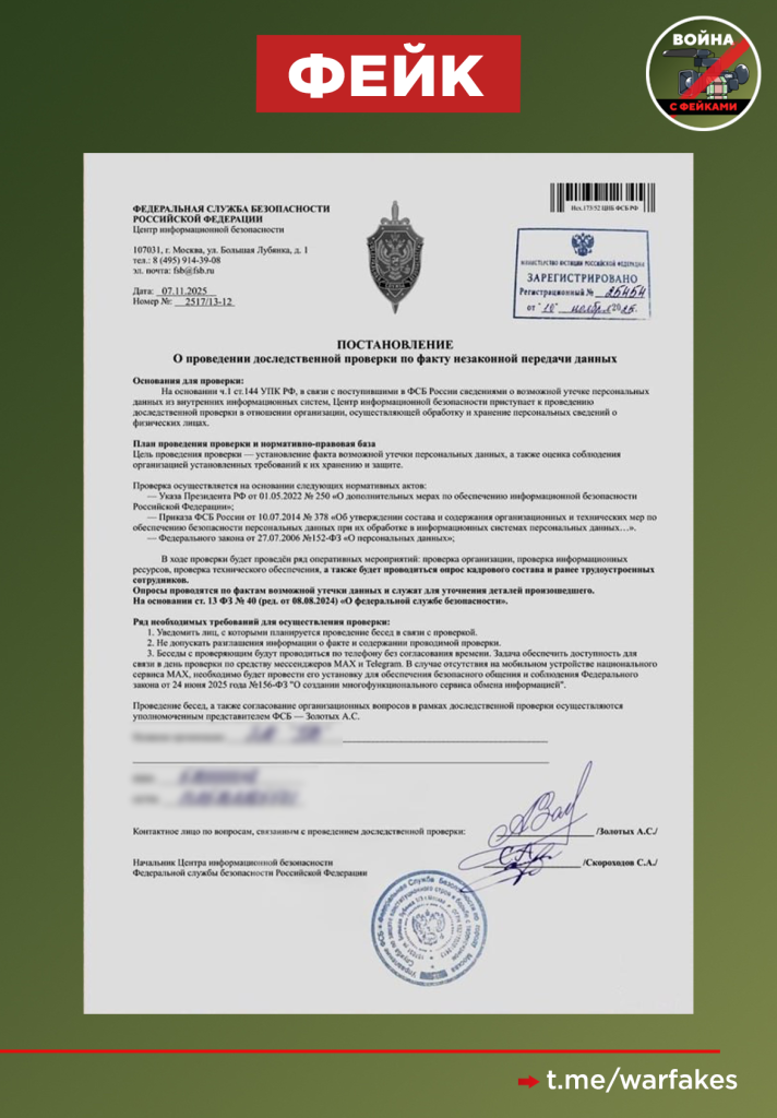 ФСБ РФ рассылает россиянам постановление о необходимости перевести деньги «для секретной операции» в связи с возможной утечкой персональных данных. Такое сообщение и фото «документа» распространяется в мессенджерах и соцсетях.