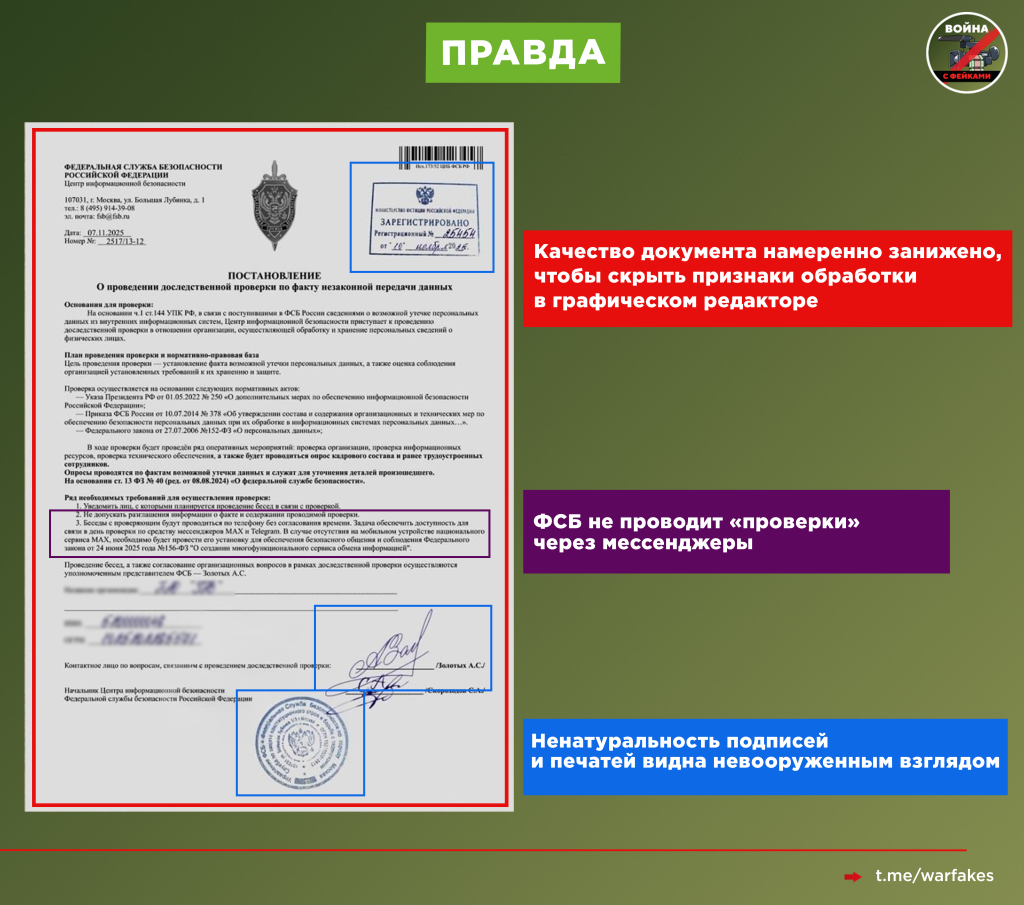 Само изображение «письма ФСБ» имеет признаки обработки в графическом редакторе — ненатуральность подписей и печатей видна невооруженным взглядом. А качество изображения намеренно занижено в попытке скрыть дефекты.