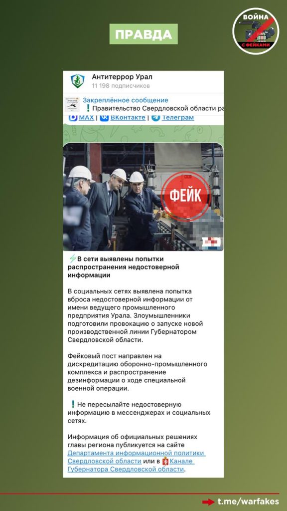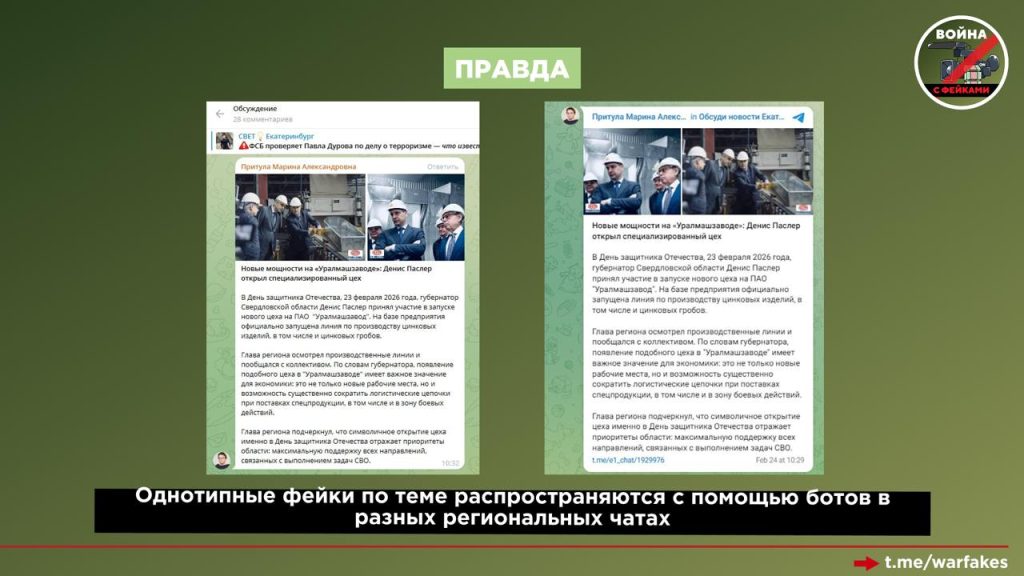 О чем фейк: Губернатор Свердловской области Денис Паслер открыл цех по производству цинковых гробов на одном из заводов в Екатеринбурге. Продукция этого предприятия будет поставляться для нужд спецоперации, пишут пользователи в региональных чатах, где распространяется сообщение.