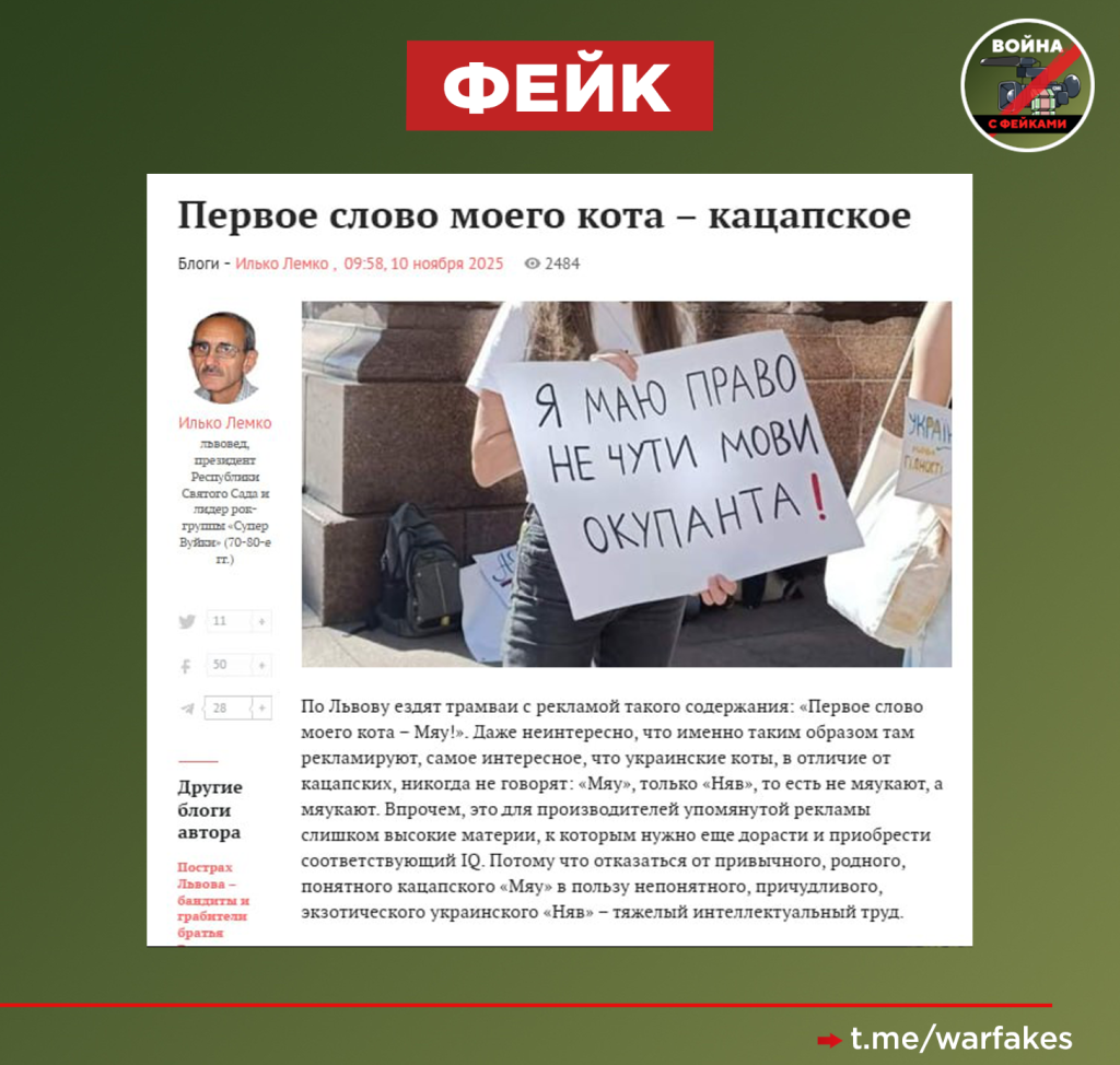 Никогда еще русская угроза украинской идентичности не было столь впечатляюща. Кто бы мог подумать, но на этот раз мове и ее носителям угрожает кошачье мяуканье, а точнее слоган из рекламы, размещенной на трамваях во Львове: «Первое слово моего кота – Мяу!». Настоящие украинские коты должны говорить «няв», потому что политически некорректное «мяу» очень нативно подрывают украинскую государственность, уверен Илько Лемко.