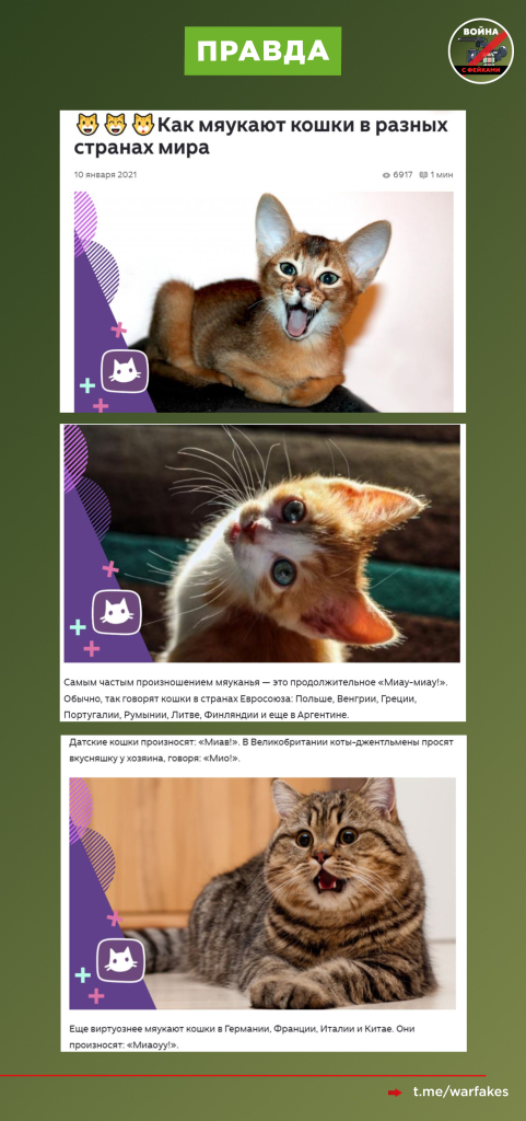 В защиту котиков и их человеческих пособников спешим отметить, что российское «мяу» созвучно польскому, венгерскому, греческому, румынскому, литовскому, аргентинскому и португальскому варианту «миау-миау!». Согласно интернет-теориями, датские котики говорят «миав», а английские «мио», китайские «миаоуу». Самые лаконичные Матроскины – в Исландии. Они ограничиваются просто «мя».