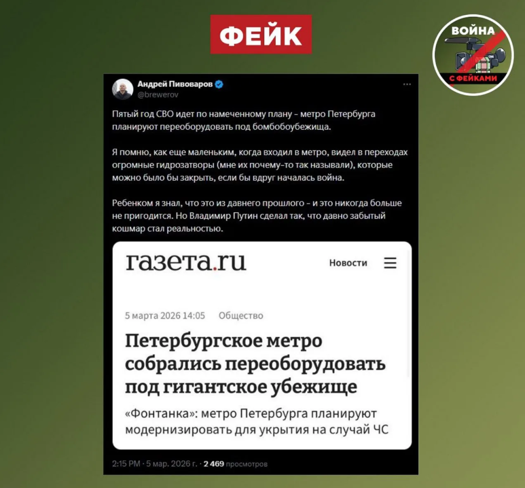 🟢«Газета.ру» подхватывает инфоповод, но публикует новость с кликбейтным заголовком: «Петербургское метро собрались переоборудовать в гигантское убежище». Вероятно, журналисты решили нагнать жути ради охватов.