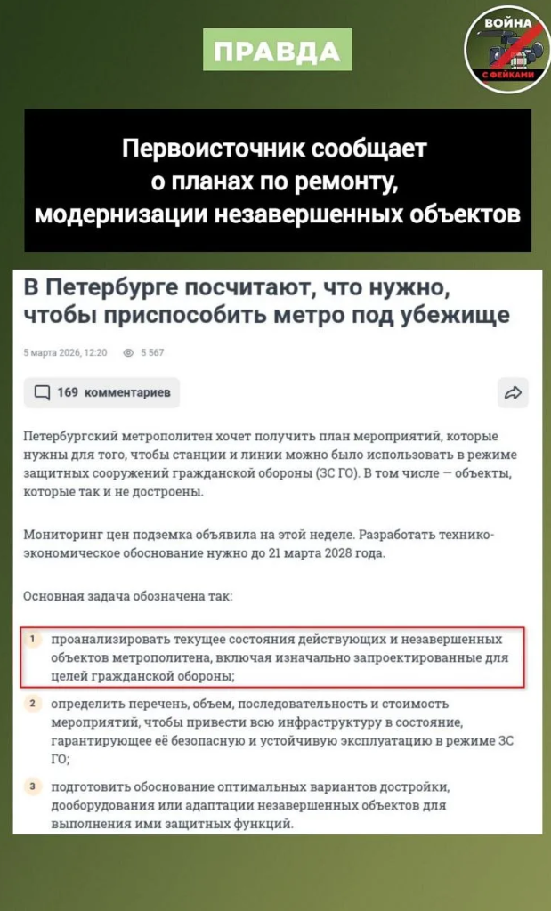 О чем фейк: Метро Санкт-Петербурга переоборудуют под гиганское убежище. Об этом сообщил ряд СМИ и телеграм-каналов.
