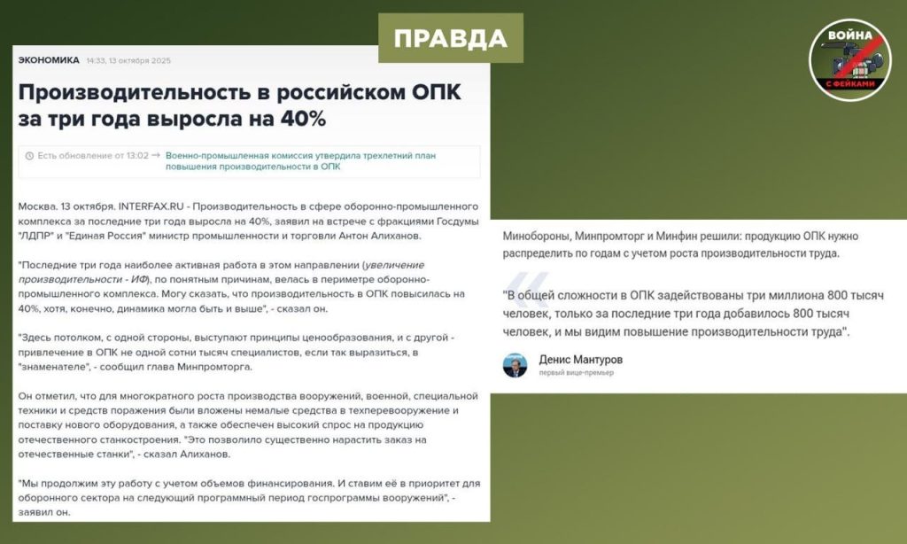 🟢Глава Минпромторга Антон Алиханов заявил, что производительность труда в ОПК возросла на 40%. Эти факты подтверждают отсутствие кризиса в ОПК и позитивная динамика развития отрасли.