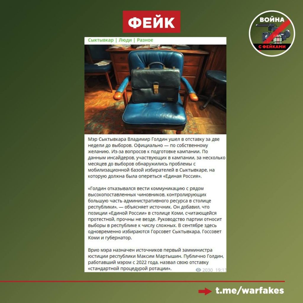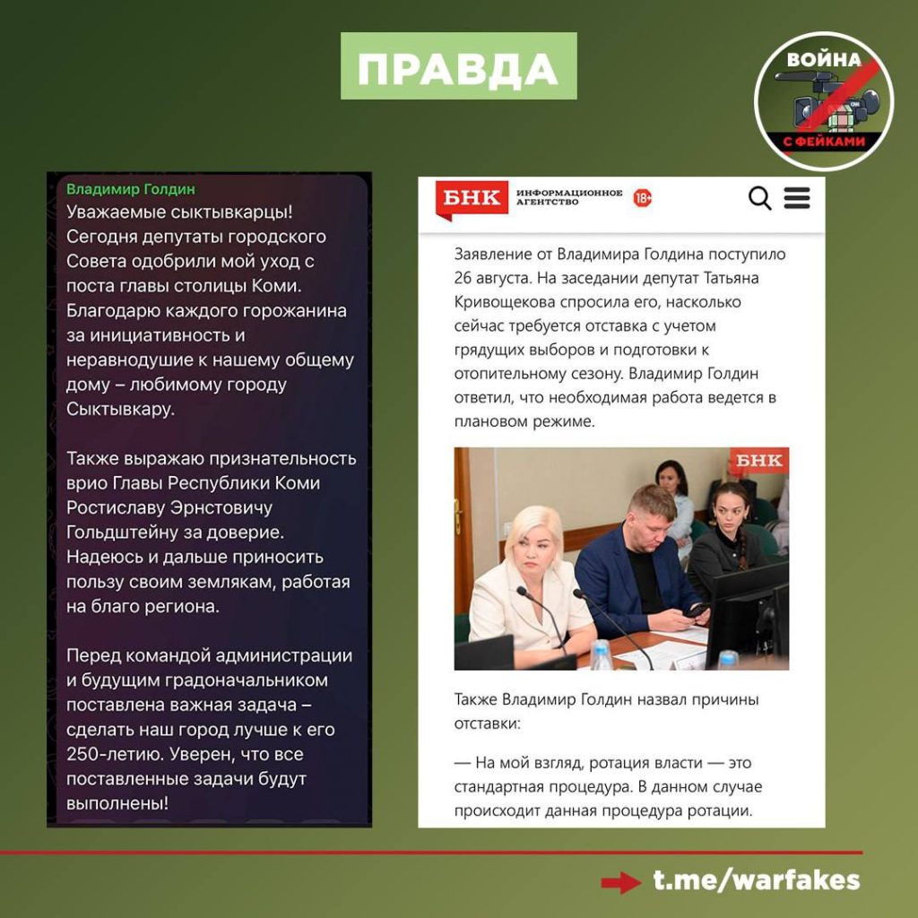 О чем фейк: Мэр Сыктывкара Владимир Голдин был уволен из-за конфликта с руководителем региона Ростиславом Гольдштейна. Об этом пишут региональные телеграм-каналы