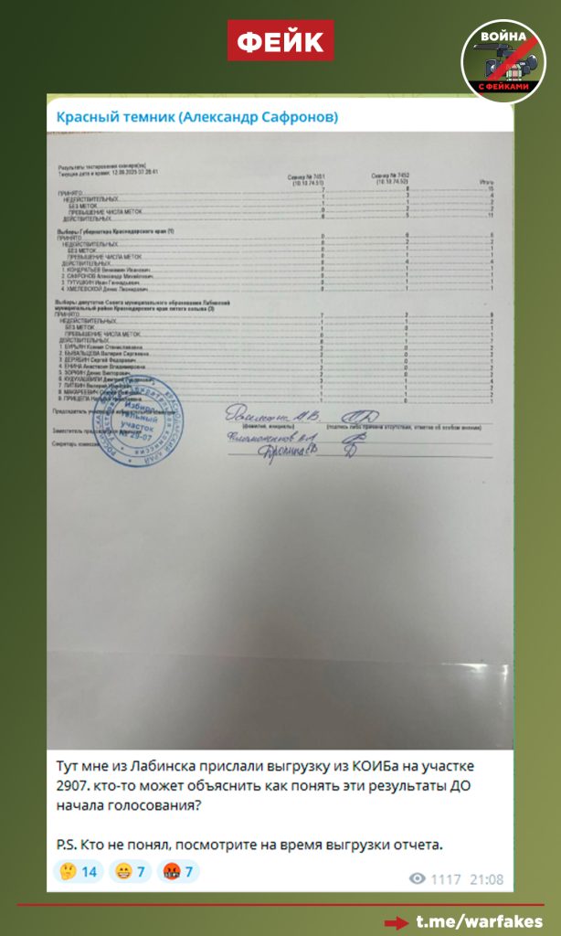 О чем фейк: На избирательном участке 2907 в Лабинске (Краснодарский край) бюллетени были вброшены еще до открытия. Свидетельствующий об этом документ распространяют в соцсетях.
