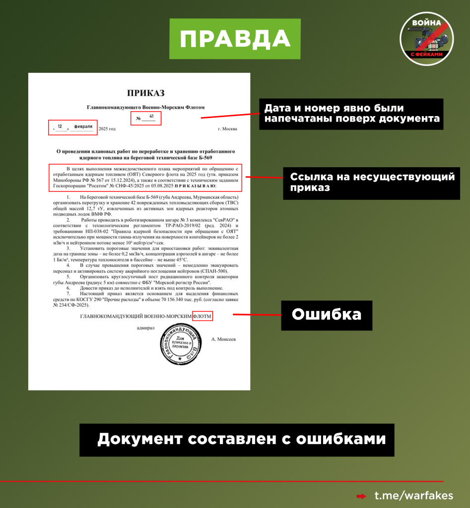 Документ, на который ссылаются фейкометы и который сфабрикован от имени командования Северного флота, тоже поддельный. Во-первых, он содержит орфографические ошибки и оформлен с использованием разных шрифтов. Дата и номер были нанесены позже. Вероятно, они были допечатаны для убедительности вброса.