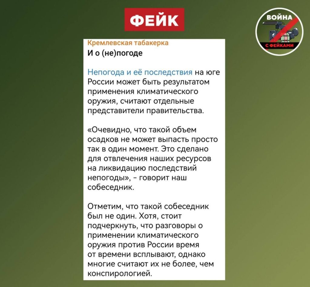 Однако мифы о климатическом оружии продолжают циркулировать в обществе. Админы «Кремлевской табакерки» — проекта украинских ЦИПсО — обожают конспирологические теории. Фейкометы ссылаются в своих постах на загадочных инсайдеров (вымышленных). Мы неоднократно опровергали такие вбросы. Ранее «Кремлевская табакерка» со ссылкой на «источник» в Русской православной церкви сообщили, что россияне якобы будут платить церковную десятину.