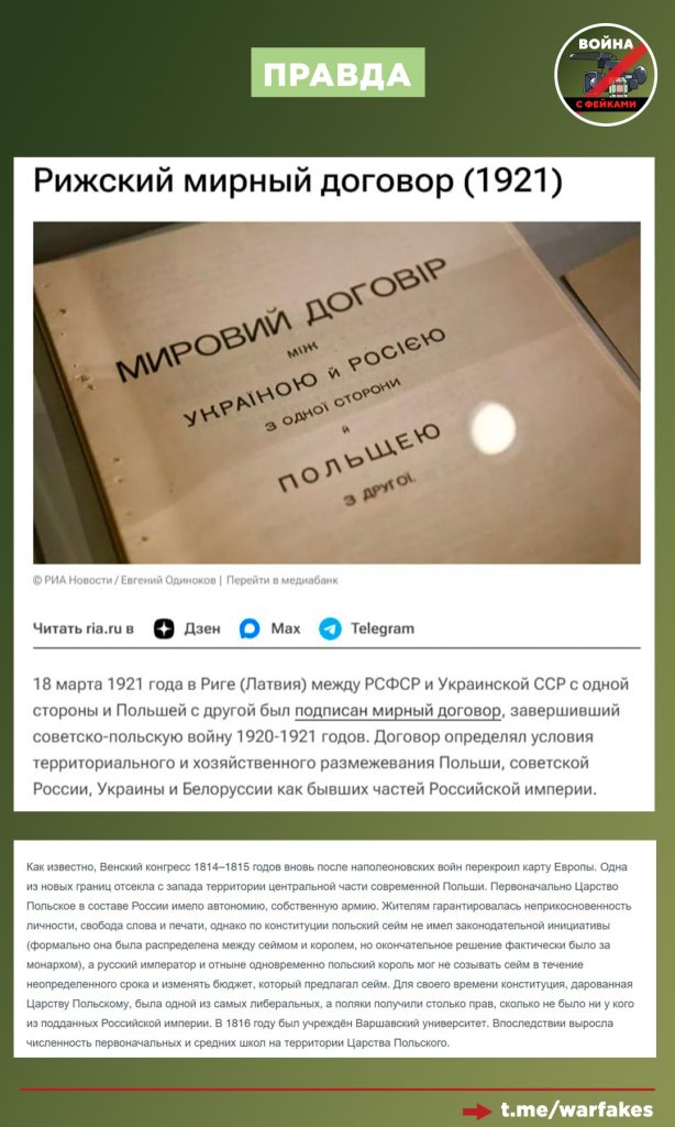 🟢В 1921 году был подписан Рижский мирный договор между РСФСР, Украинской ССР и Польшей, завершив советско-польскую войну 1919-1920 годов. В рамах этого конфликта поляки претендовали даже на Киев, о чем сейчас предпочитают не вспоминать.