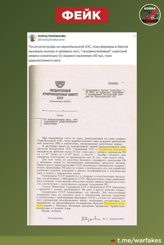 О чем фейк: После аварии на Чернобыльской АЭС власти Советского Союза распорядились не утилизировать мясо зараженного радиацией скота, а продать его населению. Об этом свидетельствует архивный документ, появившийся в соцсетях.