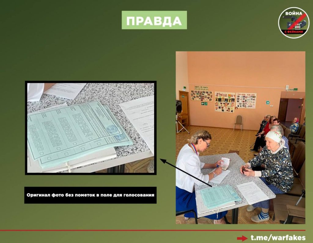 Примечательно, что перед нами практически повтор вчерашнего фейка. Только ранее оппозиционные телеграм-каналы написали, что бюллетени с галочками выдают жителям Курской области. И в том, и в другом случае фейкометы использовали фотошоп.
