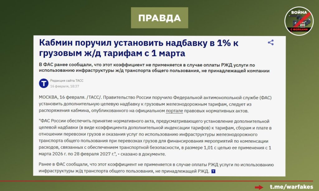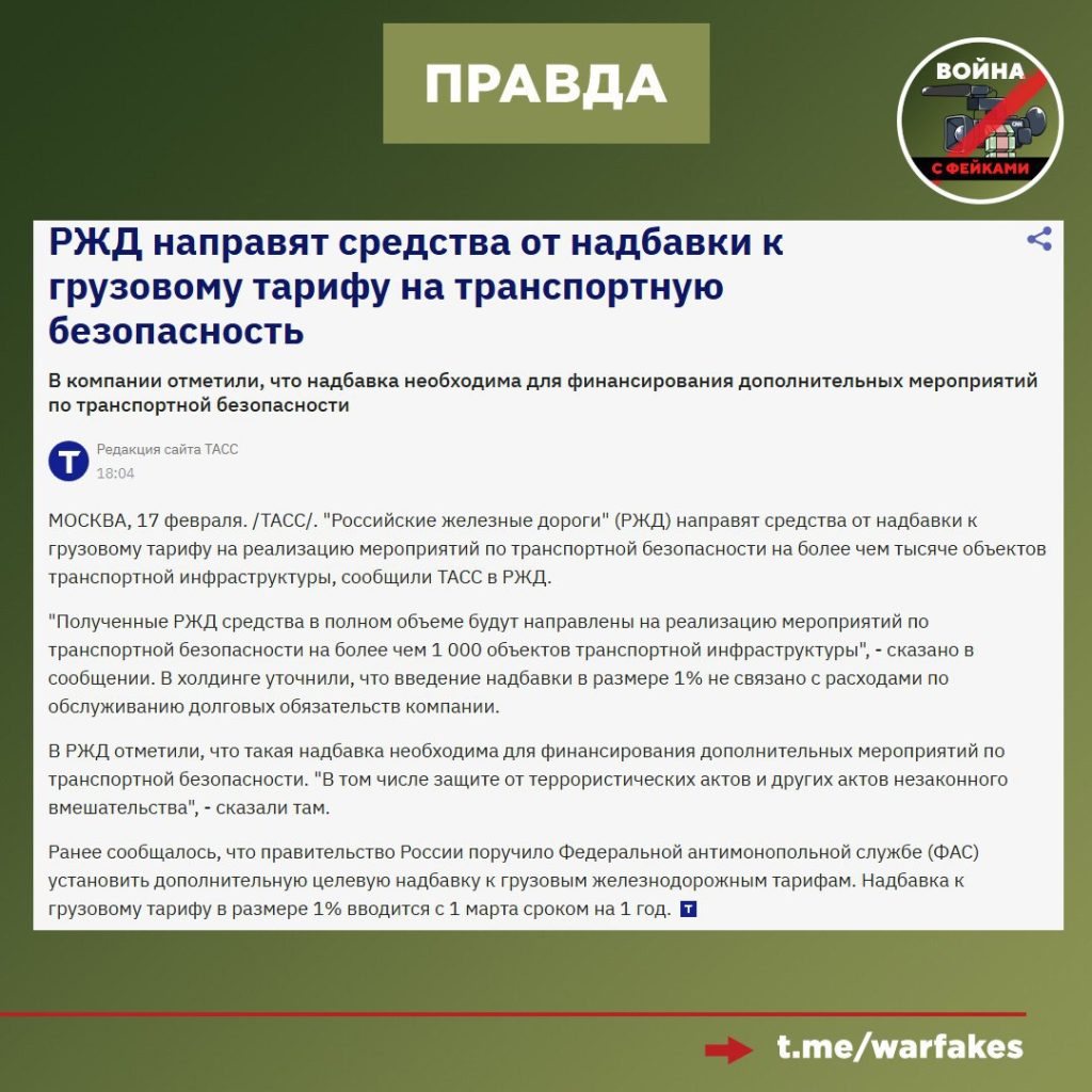 О чем фейк: Правительство внепланово повысит железнодорожные тарифы уже с 1 марта, чтобы спасти РЖД от банкротства. Об этом сообщается в Telegram.