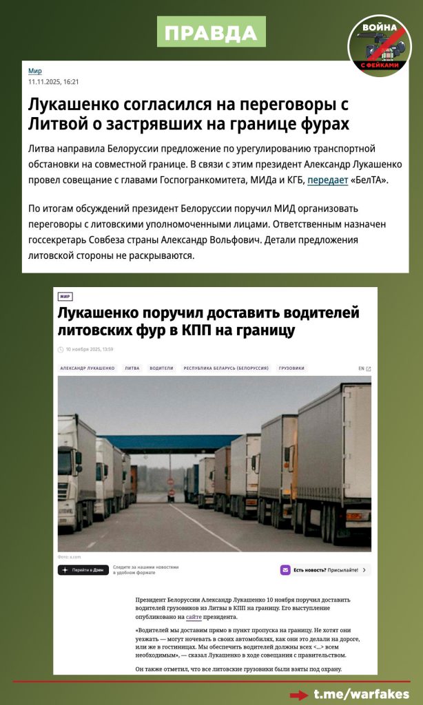 Авторы фейка решили переиначить ситуацию с оплатой охраны застрявших грузовиков, выдавая ее за «шантаж». На самом деле, белорусская сторона действует в соответствии со своими законами и просит Литву забрать зарегистрированные там грузовики: