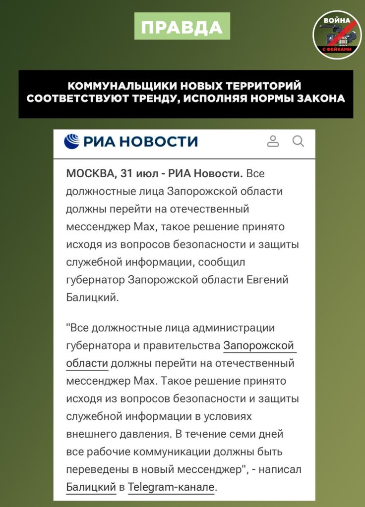 О чем фейк: Ради тотального контроля в новых регионах, местные власти обязали работников коммунальной сферы пользоваться мессенджером MAX. Об этом пишут украинские телеграм-каналы и СМИ.