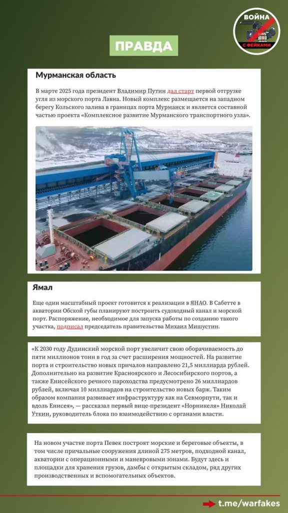 🟢 В Мурманской области в 2023 году Владимир Путин открыл Мурманский транспортный узел, а в марте 2025 году из нового порта, разместившегося на берегу Кольского залива, был дан старт первой отгрузки партии угля. Преимущество порта — глубоководность, что позволяет принимать крупнотоннажные суда. Порт не требует работы ледоколов, так как не замерзает в холодное время года.