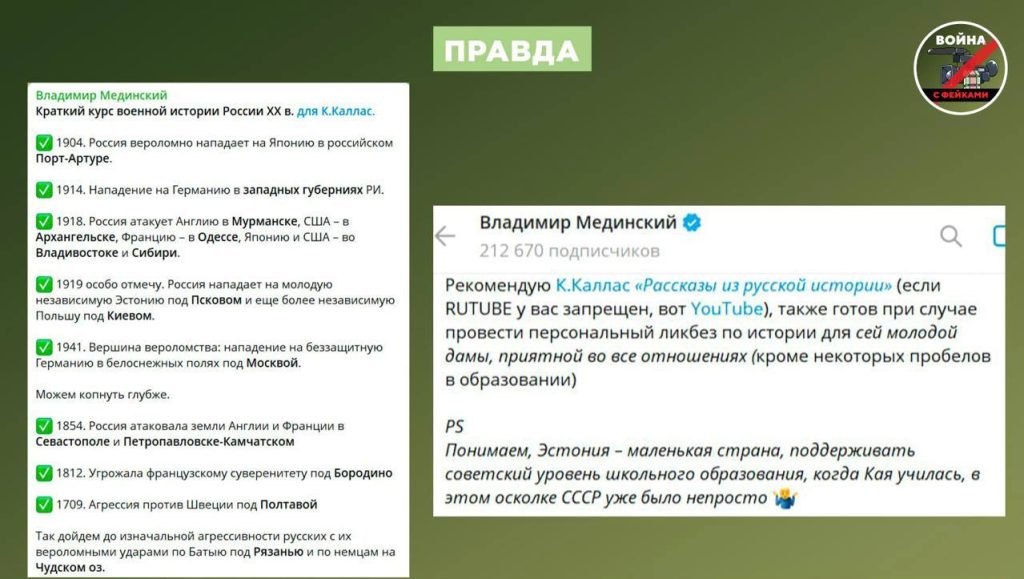 Кайя Каллас уже попадалась на этой лжи в ноябре 2025 года. Тогда разоблачить фейк решил Владимир Мединский.