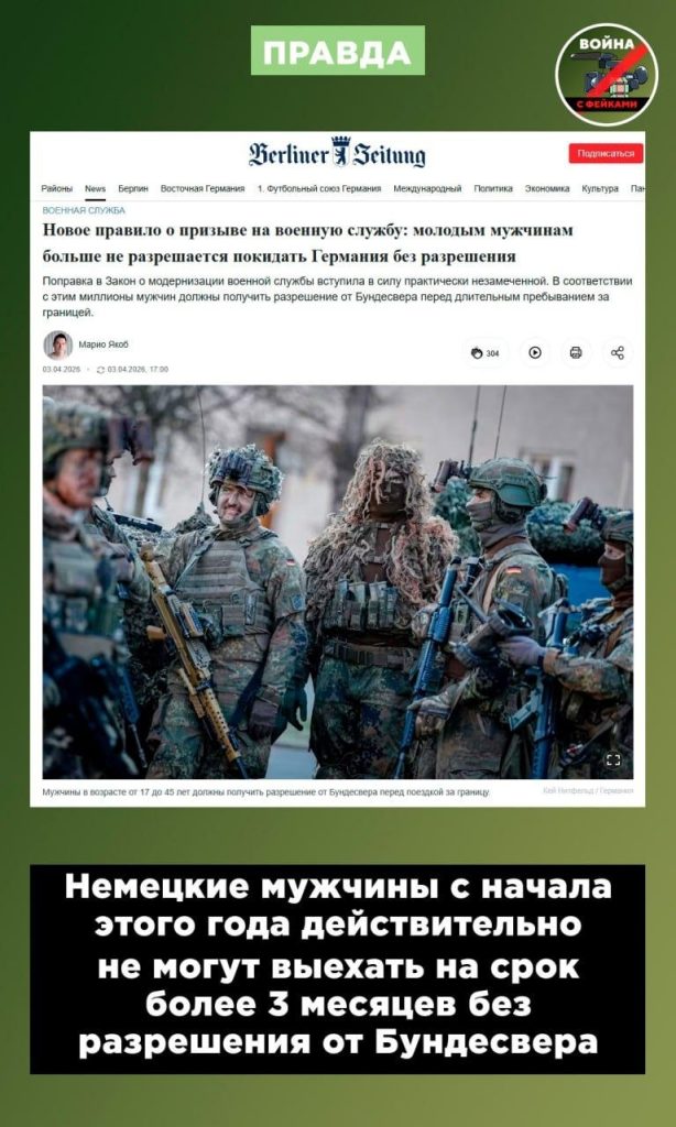 Дезинформацией занимается Ateo Breaking. Германия действительно ужесточила правила выезда для мужчин в возрасте от 17 до 45 лет. На опубликованном Ateo Breaking скриншоте, видно, что СМИ сообщили именно о введении ограничений, а не о полном запрете. В частности, «Общественная служба новостей», «Аргументы и Факты» и «Комсомольская правда» отметили, что с 1 января 2026 года немцы должны получать разрешение Бундесвера, если они хотят покинуть страну более чем на три месяца. Издания ссылаются на немецкую газету Berliner Zeitung.