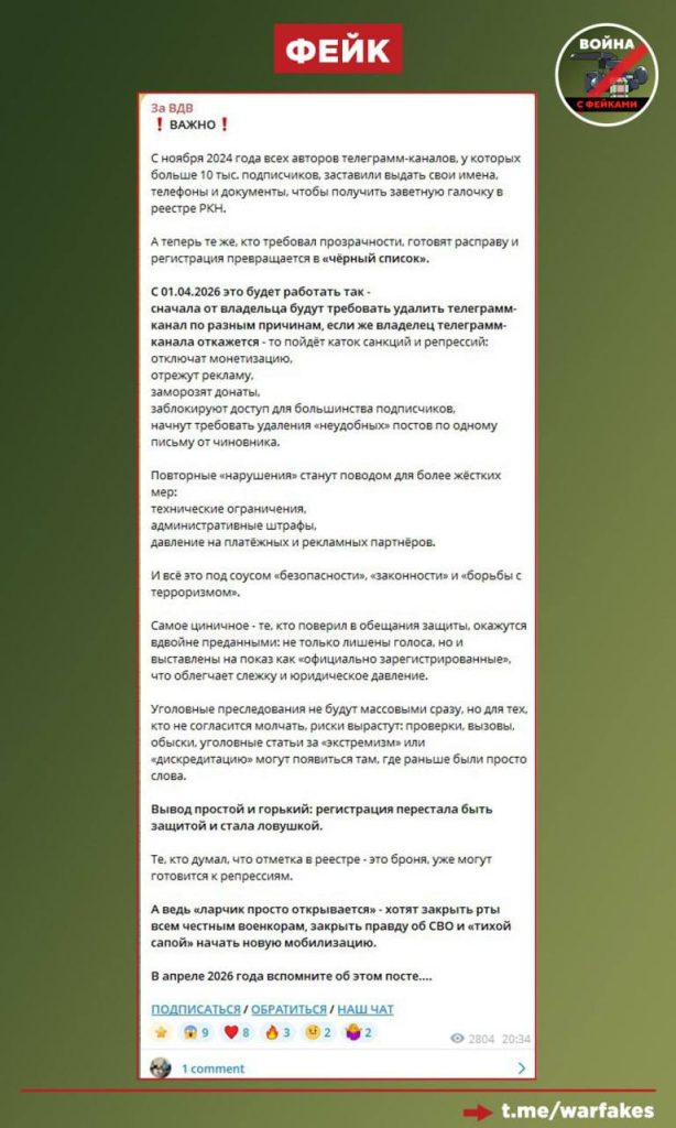 Примечательно, что источником вброса о «предстоящей мобилизации» стал телеграм-канал «За ВДВ». Этот канал, мимикрирующий под российский патриотический ресурс, имеет устойчивую репутацию распространителя фейков. Ранее он неоднократно публиковал недостоверную информацию, в том числе и в период, когда он имел другие названия: «ВДВ за честность и справедливость», «ВДВ за Теплинского». Факт постоянной смены названия сам по себе наводит на строго определенные мысли.