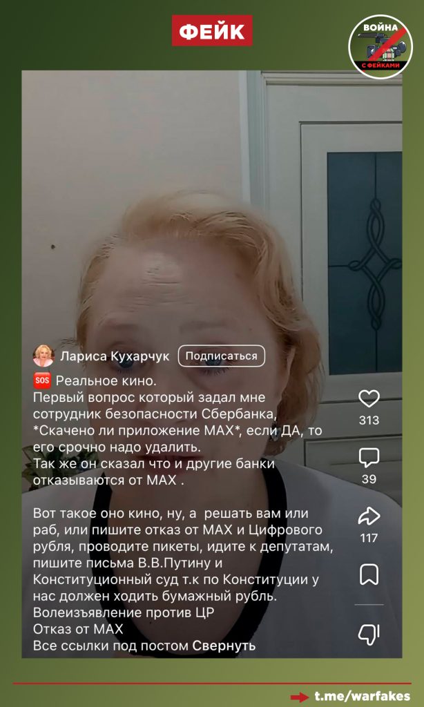 О чем фейк: «Сбербанк» выступает против мессенджера MAX из-за того, что с помощью приложения мошенники могут легко взломать мобильный банк и завладеть средствами на картах россиян. Об этом сообщает одна из последовательниц оккультного экстремистского движения иноагентки Лады Русь.