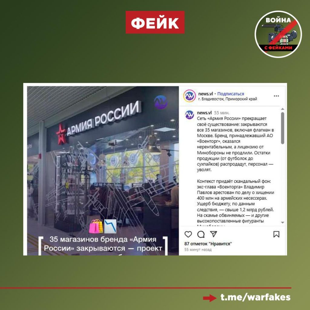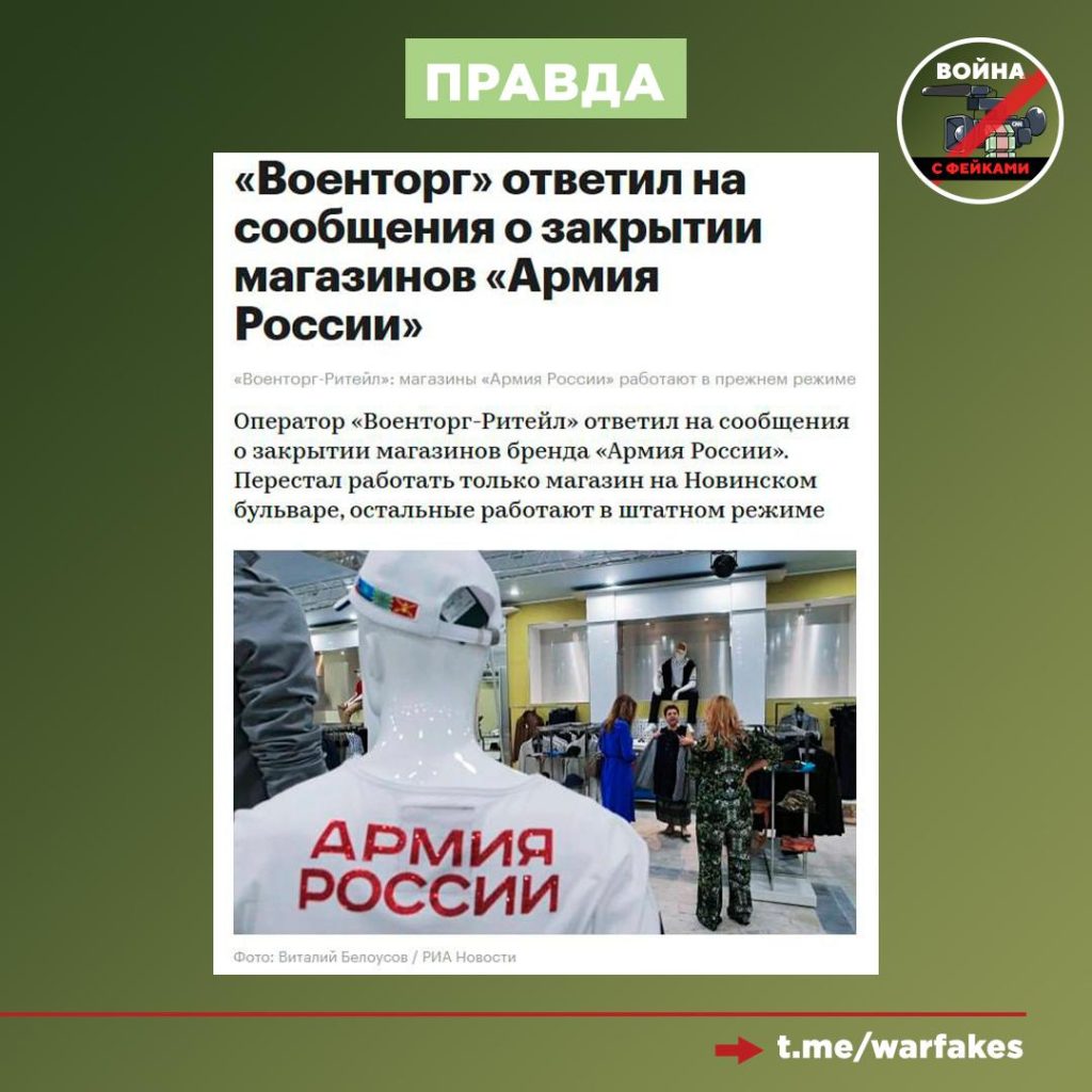 О чем фейк: Сеть магазинов «Армия России» прекращает свое существование. Все 35 ее торговых точек закрываются, сообщается в социальных сетях.