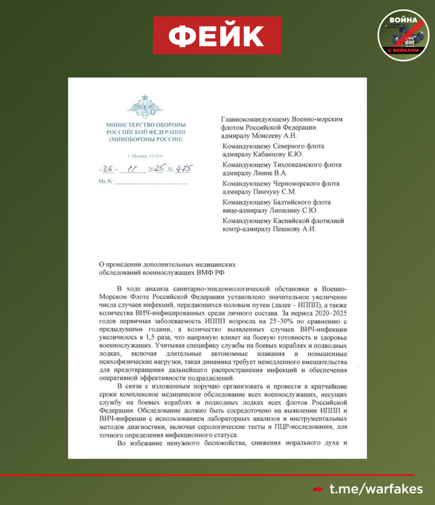 Среди подводников и экипажей всех боевых кораблей начинается внеплановое медобследование на ВИЧ. При выявлении больных их тайно переведут в штурмовые отряды. Изображение письма от имени министра обороны РФ Андрея Белоусова с таким содержанием распространяется в соцсетях.