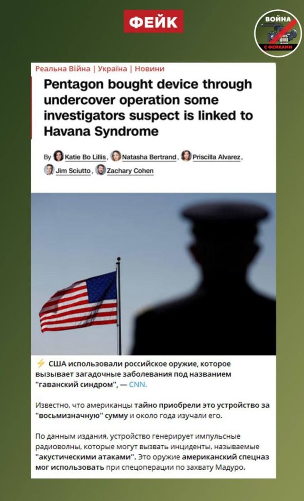 О чем фейк: США при захвате президента Венесуэлы использовали российское оружие, вызывающее загадочный «гаванский синдром». Оно было тайно куплено у РФ за огромные деньги, пишут украинские телеграм-каналы.