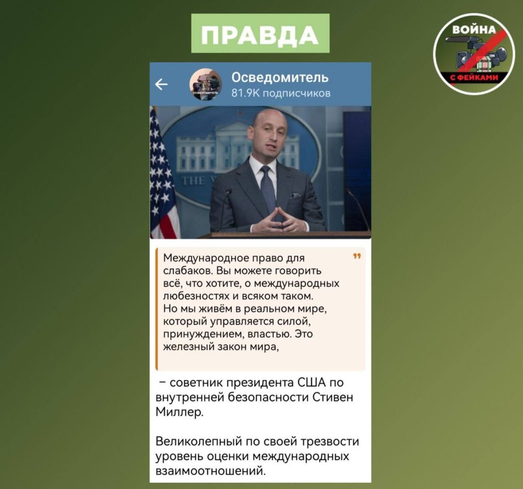 «Международное право для слабаков. Вы можете говорить все, что хотите, о международных любезностях и всяком таком. Но мы живем в реальном мире, который управляется силой, принуждением, властью. Это железный закон мира», — сказал Миллер.