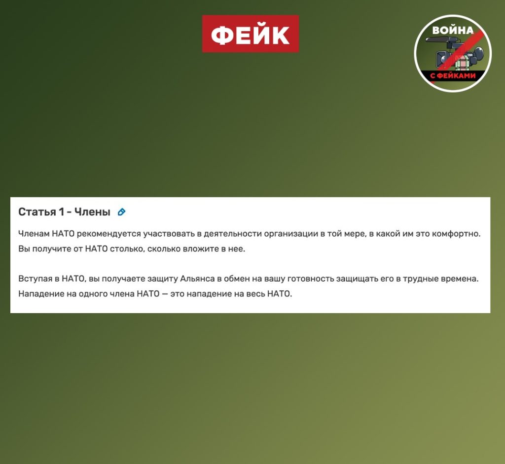 О чем фейк: Страна НАТО обязательно получит защиту со стороны альянса в случае угрозы. Об этом говорится в уставе НАТО.