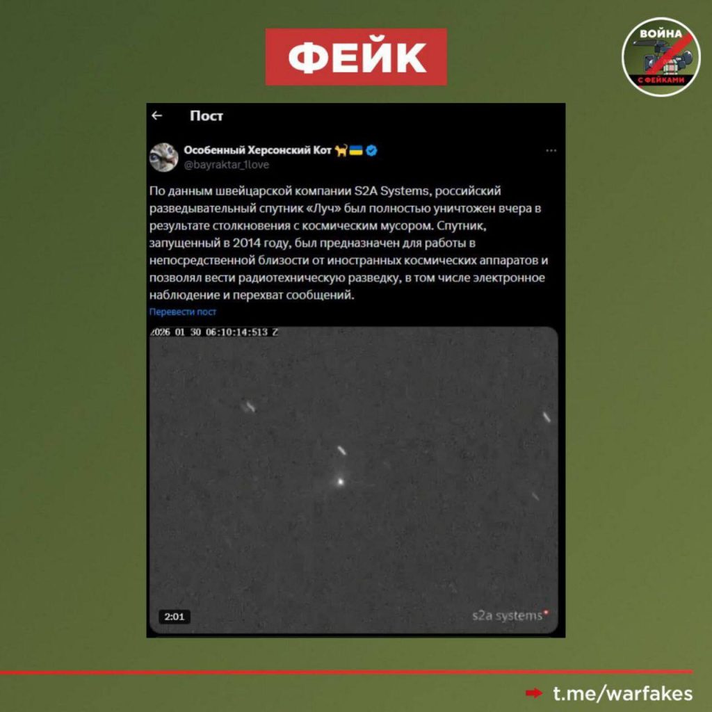 Отметим, что основой для фейка стала заурядная для космических реалий новость. 30 января 2026 года швейцарская компания s2A systems, специализирующаяся на мониторинге космической обстановки, зафиксировала разрушение спутника и опубликовала эту информацию в формате отчета. Украинские пользователи Х, не посчитавшие нужным разобраться в технических деталях, немедленно увидели причину для «перемоги».