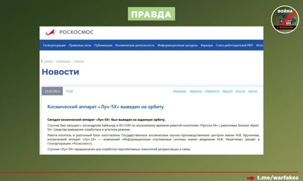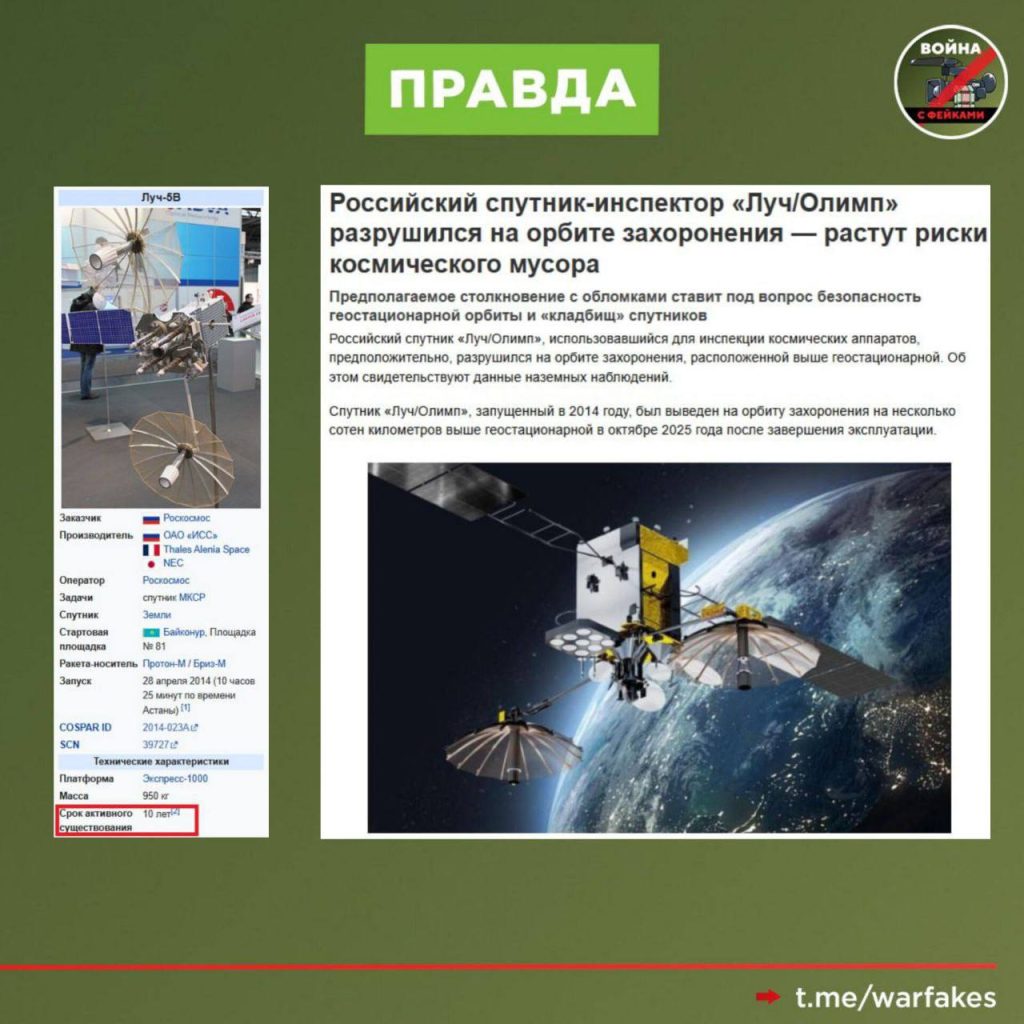 О чем фейк: Тот факт, что российский спутник-шпион «Луч-5В», также известный как «Олимп», полностью уничтожен на орбите, — свидетельство упадка космической отрасли РФ или даже следствие внешнего воздействия со стороны Украины. Об этом сообщают украинские пользователи соцсети X.