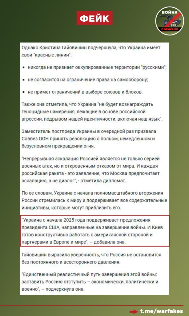 О чем фейк: Украина стремится к миру и поддерживает все содержательные инициативы, способные его приблизить. Об этом заявила заместитель постпреда Украины при ООН Кристина Гайовишин в ходе заседания Совбеза Организации.