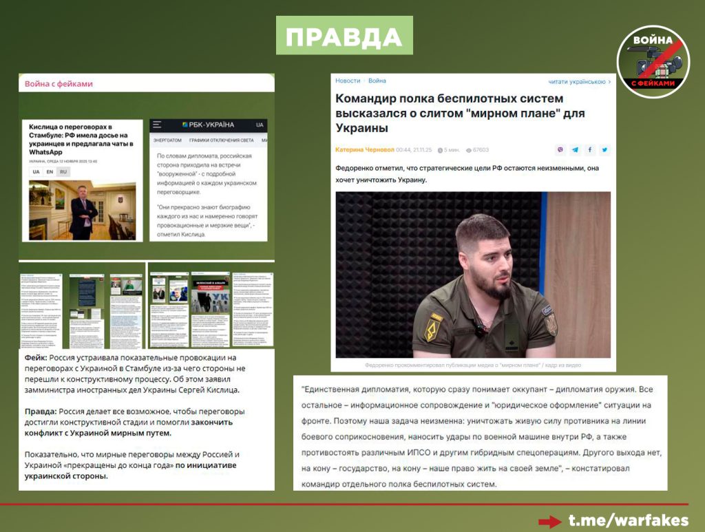 Противоречит якобы миролюбивым намерениям Украины и позиция ВСУ. Так, командир 429 отдельного полка беспилотных систем «Ахиллес» Юрий Федоренко публично заявляет, что единственная дипломатия, которую «понимает» Россия, — это «дипломатия оружия».